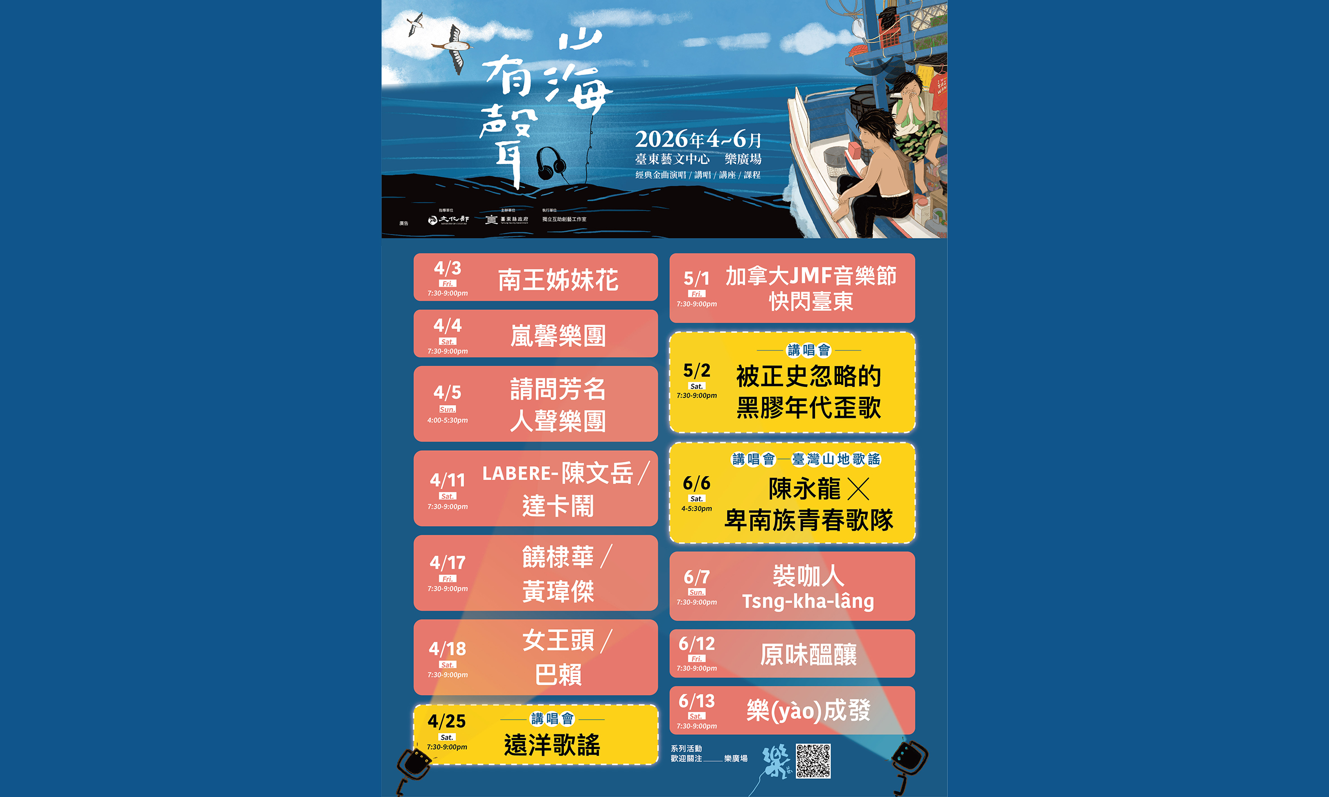 「寫信告訴我今天,海是什麼顏色。」 樂廣場從時代歌謠唱到當代創作, 可能有你心中的經典, 或是感受live的當下新增一首即將成為經典的好歌。 如果你收到這封邀請信, 歡迎來現場告訴我們, 你今天聽到的那片海是什麼顏色。 樂廣場負責準備一場場音樂演出, 而你要負責準備空出一些時間, 準備好耳朵,一起來聽歌! 🎤演出地點: 臺東藝文中心大廳/廣場 臺東市南京路25號