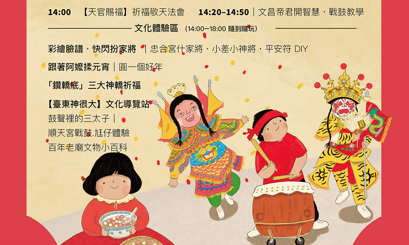 紅吱吱 過好年~ 在這個什麼都講求免費的時代 我們也趕潮流,辦一場免費快閃文化體驗活動 好好的認識臺東的無形文化資產民俗-臺東元宵神明遶境活動 快閃活動約四個小時 活動豐富多元,大人小孩都適合 有祈福小儀式、家將臉譜彩繪體驗、跳太子,以及大家喜歡的搓湯圓及現場煮湯圓等 我們 3/1 下午 2 點在鐵花村人行步道廣場等大家一起來玩耍!