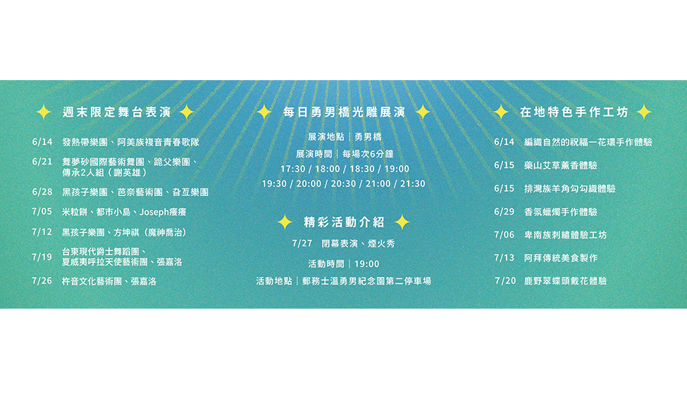 開幕點燈活動|6/13 (五)19:00 —— 沈浸式火舞劇 —— 勇男橋 光雕展演(約6分鐘)|每日17:30 / 18:00 / 18:30 / 19:00 / 19:30 / 20:00 / 20:30 / 21:00 / 21:30 閉幕表演活動&煙火秀|7/27(日) 光泉市集、跳跳島樂園|7/26(六)&7/27(日) 活動限定提燈:台東光祭 小「花」燈 限量供應。