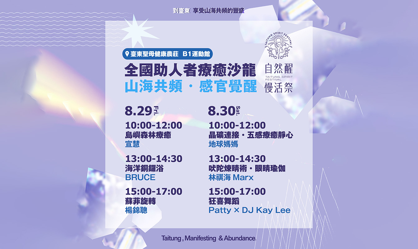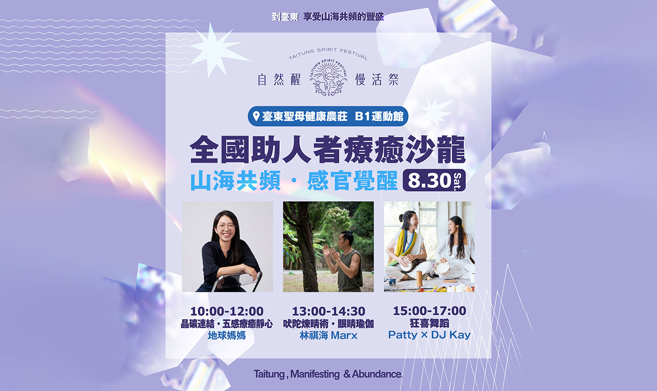 慢,是台東的節奏。 在山海的共振脈動中,人自然會回到大地的頻率,舒服而放鬆。 慢下來,我們才能好好呼吸,好好吃飯,咀嚼當下每一刻的滋味。 慢下來,我們才能瞥見周遭的美,感受海風的吹拂與溫度,聽見自然的低聲呼喚。 8/29-8/30「山海共頻・感官覺醒」,純粹的去經驗、感受「存在」的美好。 第一天,我們試著把注意力回到自己的身上,從嗅覺探索開始,與森林對話遊戲。接著,我們浸泡在聲音SPA中,享受徹底放鬆的輕鬆舒暢。最後,我們在蘇菲旋轉中,感受像孩子般的純真與自由。 第二天,我們透過晶礦來覺察自己的身心狀態,在與晶礦連結的過程中,淨化並療癒自己。下午時光,我們練習眼睛瑜珈,舒緩壓力,促進與大腦的深度連結。最後,在音樂與能量的流動中,狂喜歡舞,卸下一切的框架,讓靈魂自由綻放。