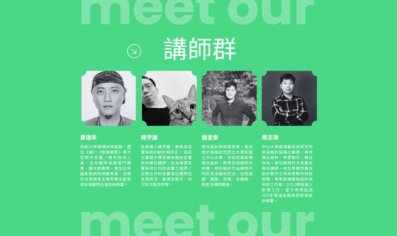 ✔ 兩大主軸:「劇場技術基礎」與「舞台管理基礎」 ✔ 共計超過60小時專業訓練 ✔ 選定課程,全程參與核發上課證明 ✔ 可自由選課,全程參與優先錄取! ✨【劇場技術基礎課程】 燈光|音響|舞台機械|影像|對講系統|舞台布景⋯通通學得到! ✨【舞台管理基礎課程】 從演出流程、溝通協調到現場調度,學習劇場中最核心的組織角色。 ✨【共同課程】 認識劇場產業、劇場安全實務、就業與勞動權益完整解析。