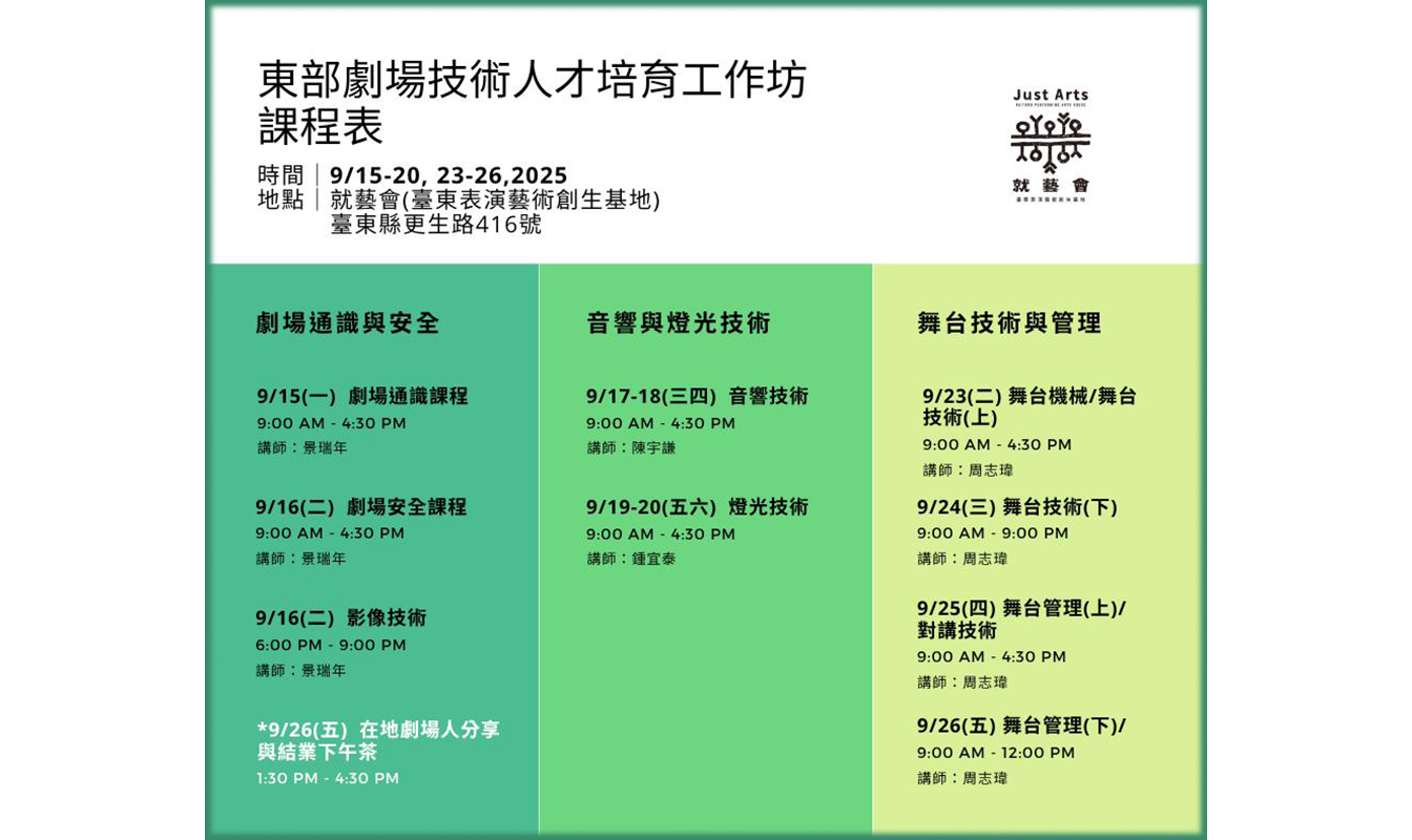 2025 劇點計畫:東部劇場技術人才培育工作坊|免費參加🔥 台東限定20名! 隨著台東表演藝術活動越來越蓬勃,劇場技術與舞台管理人才的需求正快速增加!這次的培訓計畫,將在就藝會展開,邀請你走進劇場專業領域,學習第一手技術!