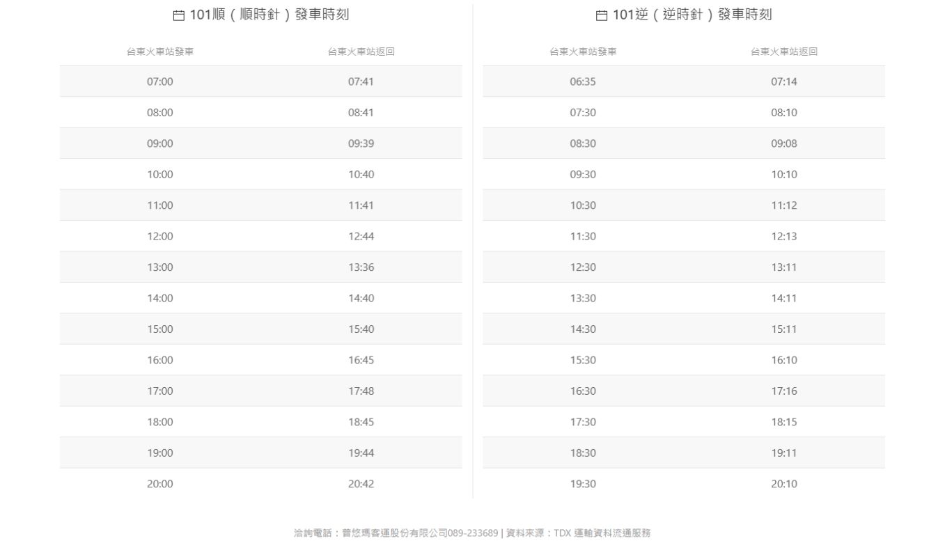 可由台東火車站、台東豐年機場、台東轉運站(秀泰影城旁)招呼站搭乘排班計程車 其他地點請撥打電話叫車服務: 1. 台東親善運將 2. 無障礙計程車 3. 台東大都會 - 衛星派遣計程車隊 0980-663-103 4. 一桐計程車 089-324-282、089-325-577 5. 三馬計程車 089-327-770、089-322-000 6. 55688台灣大車隊 手機、市話直撥55688
