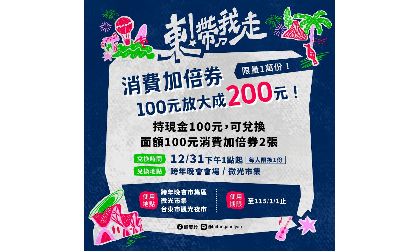 12月31日下午1點起,持100元現金可兌換100元消費加倍券2張,可於跨年晚會會場、微光市集指定窗口兌換,每人限換1份,限量1萬份等你來換! ⟡ 使用地點 ⟡ ➀臺東跨年演唱會市集區(海濱公園) ➁臺東市觀光夜市 ➂臺東市微光集市集 ✦使用期限至115年1月1日止,在跨年加倍享受👍