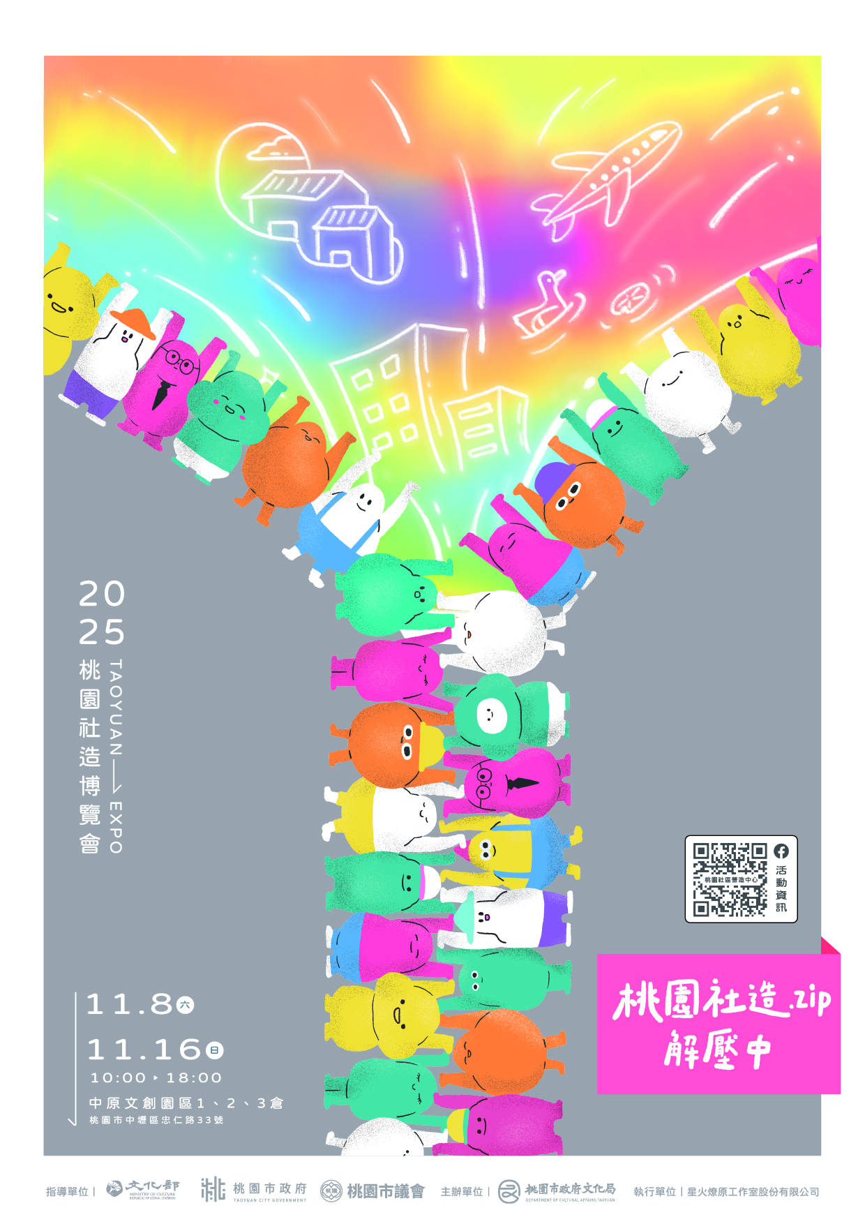 為呈現桃園市推動社區總體營造成果,邀請各單位夥伴一同體驗桃園社造「解壓縮」的瞬間,一次展開市府跨局處、區公所及社造點等,超過90個單位的行動方案與成果,完整呈現桃園文化的流動、交織與共生。
