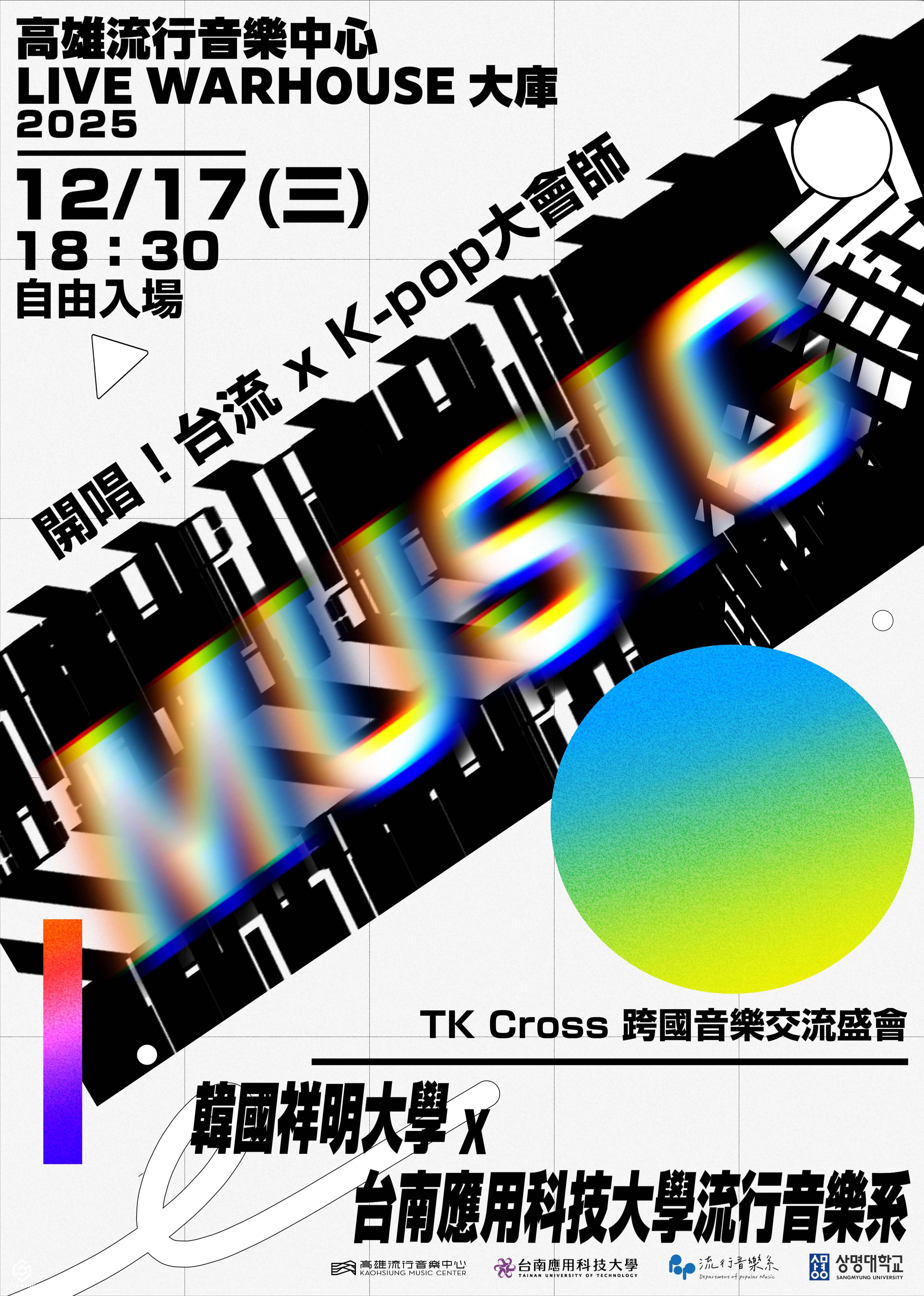 一、台南應用科技大學流行音樂系與韓國祥明大學共同舉辦「TK Cross 音樂交流盛會」,本活動為臺灣與韓國首次針對年輕學子之流行音樂學術交流。