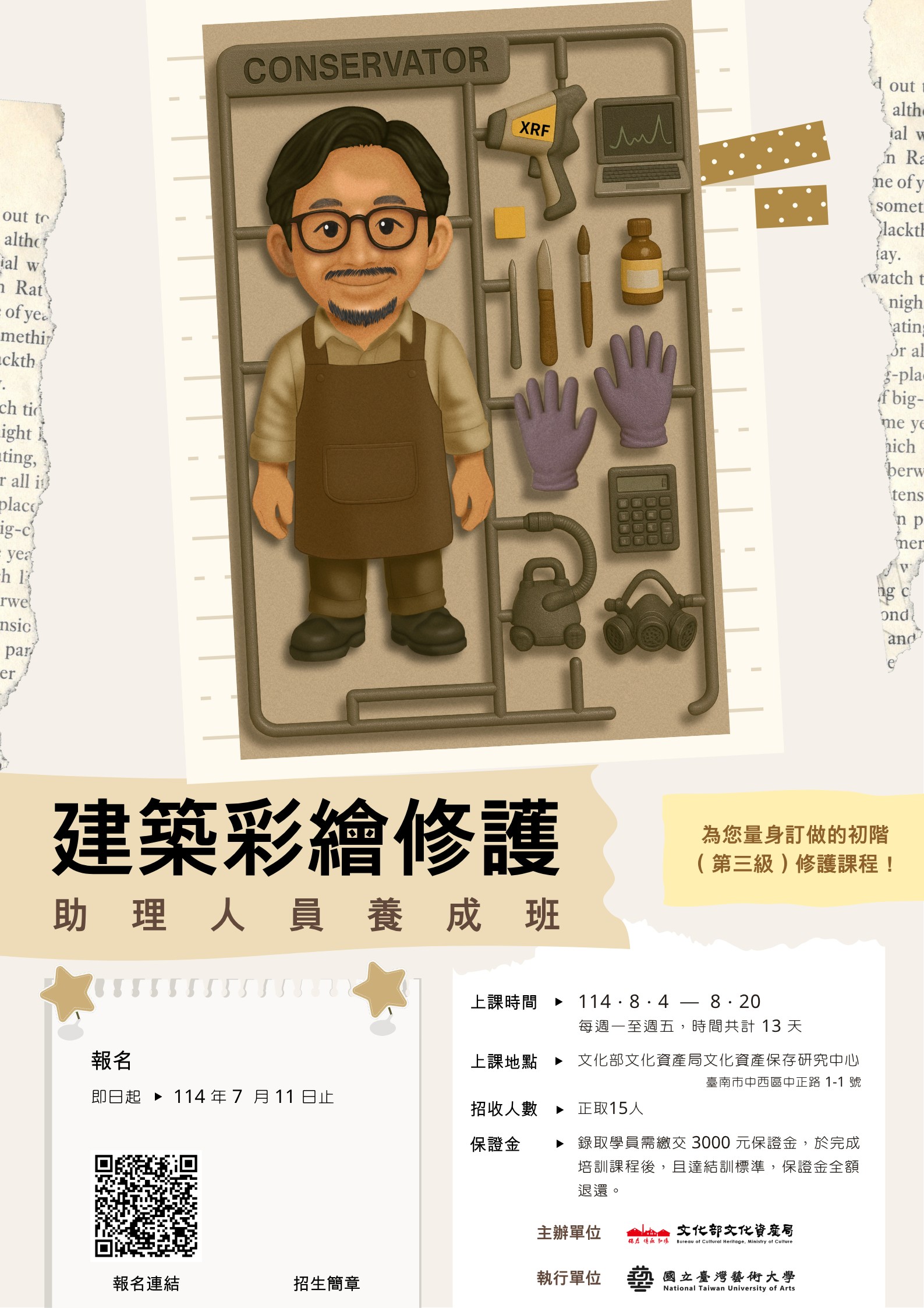 一、為落實文化資產保存修護人才的培育工作,將建築彩繪修護人員的知識與技能予以顯性化,提升文化資產修護職能,培育產業所需的人才,辦理「建築彩繪修護助理人員養成班」職能導向課程。