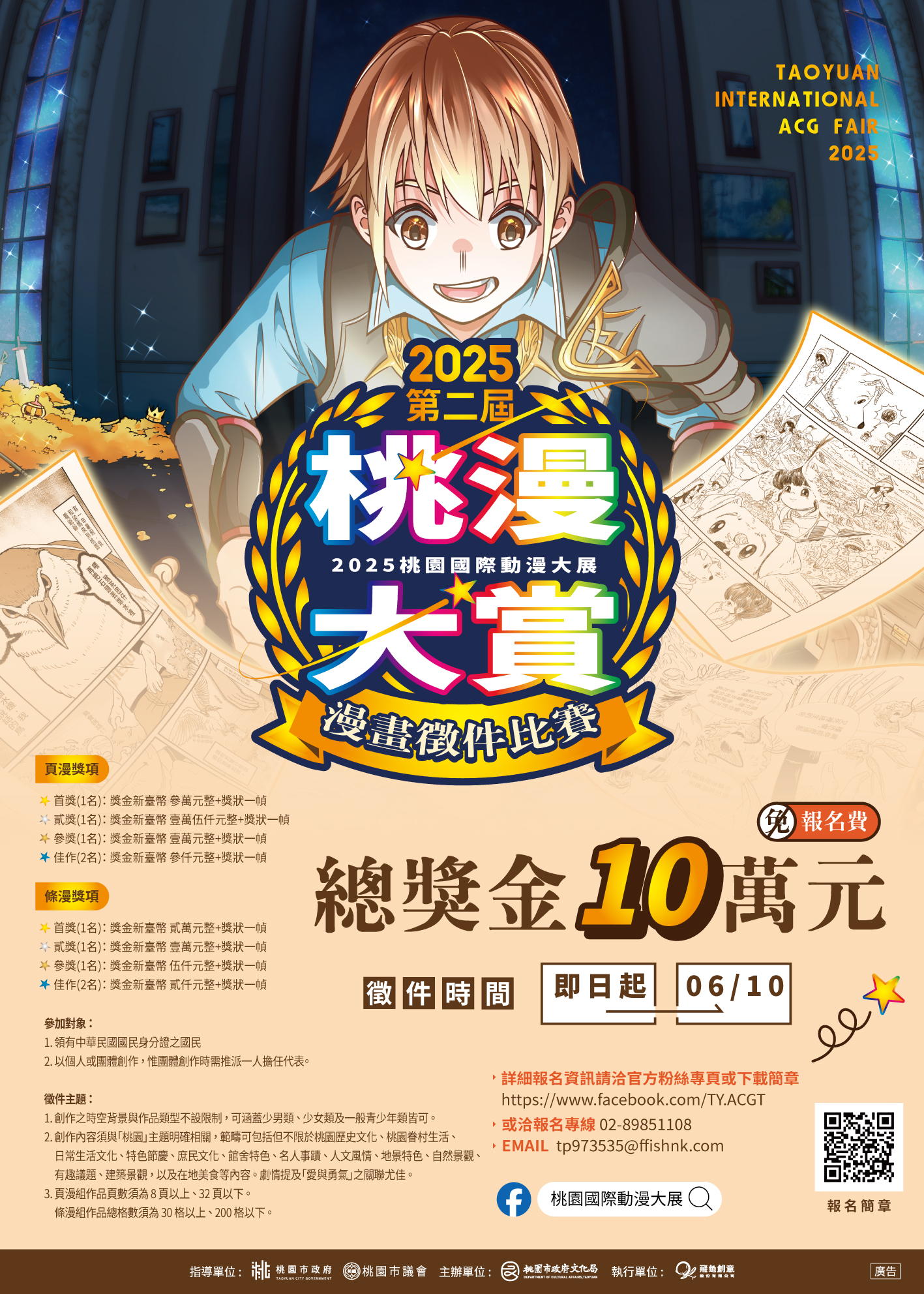 一、為發揚臺灣原創漫畫創作能量,給予全國漫畫有志之才展現能力的舞台,桃園市政府文化局規劃辦理旨揭活動,報名時間自即日起至今(114)年6月10日17時止(以郵戳為憑)。