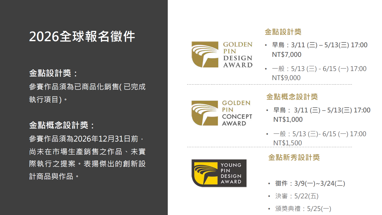 >>報名資格:參賽作品須為本年12月31日前,尚未在市場生產銷售之作品、未實際執行之提案,申請單位可為公部門、廠商業者、設計團隊或學生,以團體或個人方式報名。