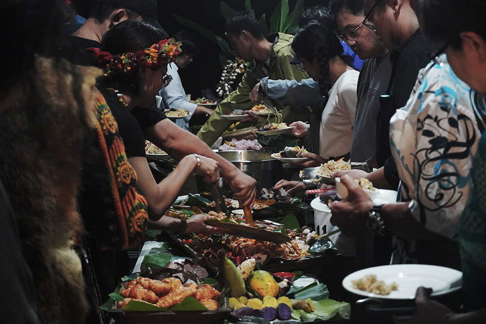 這次跨洋相聚得來不易,為了把握寶貴的深度交流時間,在獵團空間(男性)分享關於文化與海洋交織的經驗談之外,獵人學校更為船團成員掛上披肩、共飲連杯酒,表達對他們的尊重、友好之意;而幫團空間(女性)則談到台灣與帛琉友邦之間緊密的國際關係、當代原住民族面臨的困境等。暮色漸暗,我們的心靈在言談間滋養茁壯,身體所需的飽足感就交由料理職人,端出的佳餚美饌無不令人食指大動!宴席間歡愉的歌聲、笑聲、舞動的身影皆化為此刻最美的南島印象。